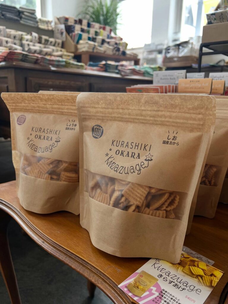 投稿日: 2025年10月10日 投稿者: kinari倉敷おからクッキー 「倉敷おからクッキー」再入荷しました! 毎朝、お豆腐屋さんで採れる 100%国産大豆の新鮮な「生おから」を使用しています。 おからは低カロリーなのに、お腹でしっかり満足! たんぱく質・カルシウム・食物繊維など栄養も豊富で、ダイエット中のおやつにもぴったりです。 お子さまにも安心して食べていただける優しい味わい すでにリピートしてお買い上げの方も多い人気商品です。 クッキーより少し固めの「きらずあげ」もおすすめ。 塩味・しょうゆ味、どちらもやみつきになる美味しさです!